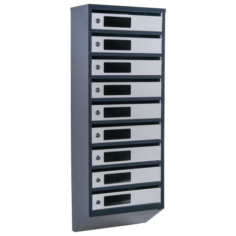 Ефективний та стильний, Поштовий ящик LEVMETAL багатосекціний Е1-03.А розроблений для надійного та організованого прийому листів та іншої кореспонденції в багатоквартирних будинках. З його сірим корпусом та декоративною перфорацією дверцят, цей ящик об'єднує стиль і функціональність, надаючи вашому вхідному простору сучасний вигляд.