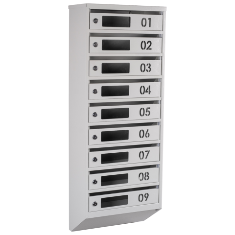 Косі секції зі щілинами та клапанами забезпечують легкий доступ до пошти для кожного мешканця. Дверцята з віконцем для перевірки кореспонденції роблять використання скриньки ще зручнішим.