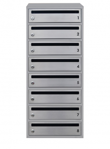 Сірий колір моделі E2-08.F виглядає стильно та гармонійно. Вирізані номери квартир та щілина роблять цей поштовий ящик практичним та естетично вигідним.