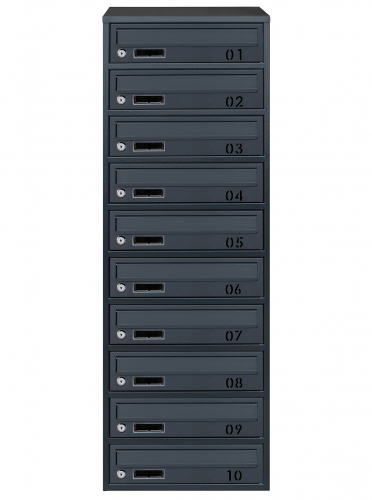 Поштова скринька LEVMETAL багатосекційна Е2-10.B у кольорі антрацит (RAL 7016) призначена для встановлення в багатоквартирних будинках. З щілинами та клапанами на дверцятах дозволяє легко отримувати листи та іншу кореспонденцію.