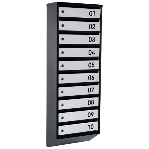 Поштовий ящик LEVMETAL багатосекціний Е1-03.D в антрацитовому кольорі обладнаний віконцем для перевірки кореспонденції та вирізаним номером квартири на дверцятах, що полегшує вам приймання та відправлення листів. Замок з двома ключами гарантує безпеку і захист вашої пошти.