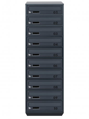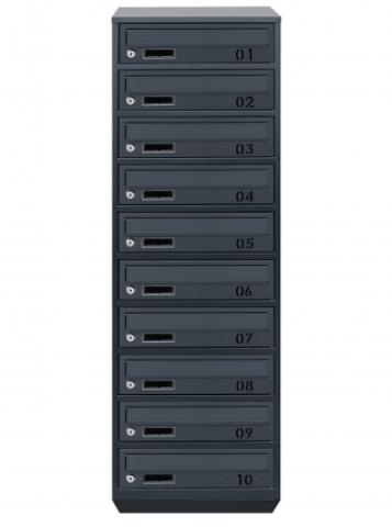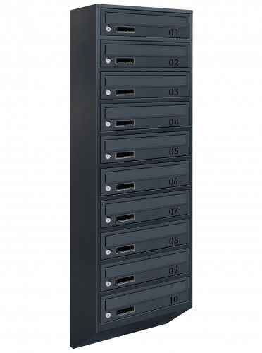 Поштовий ящик LEVMETAL багатосекціний Е1-10.B у кольорі антрацит (RAL 7016) призначений для встановлення в багатоквартирних будинках та забезпечення комфортного та безпечного прийому пошти для 10 квартир.