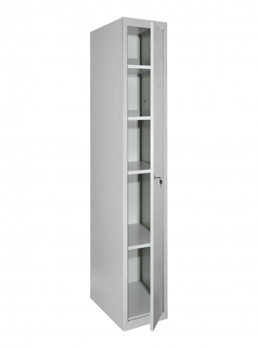 Матеріал: Метал, Покриття: Полімерно-порошкове, Конструкція: Збірно-розбірна, Товщина металу 0.5 мм, Тип шафи: Господарський (ШГМ), Кількість секцій: 1, Кількість дверей у секції: 1, Кількість відділень: 5 з можливістю регулювання висоти полиць