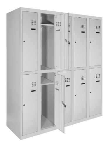 Кожна секція шафи обладнана 4 гачками для легкого підвішування одягу, перекладеною для вішаків, а також поличкою для зручного розміщення речей. Крім того, кожна секція оснащена врізним механічним замком типу прапорця з двома ключами для забезпечення максимальної безпеки зберігання. Таким чином, шафи одягові металеві є надійним та функціональним рішенням для організації зберігання одягу у будь-якому приміщенні.