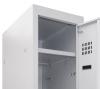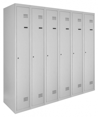 Кожна секція шафи обладнана 4 гачками для легкого підвішування одягу, перекладеною для вішаків, а також поличкою для зручного розміщення речей. Крім того, кожна секція оснащена врізним механічним замком типу прапорця з двома ключами для забезпечення максимальної безпеки зберігання. Таким чином, шафи одягові металеві є надійним та функціональним рішенням для організації зберігання одягу у будь-якому приміщенні.