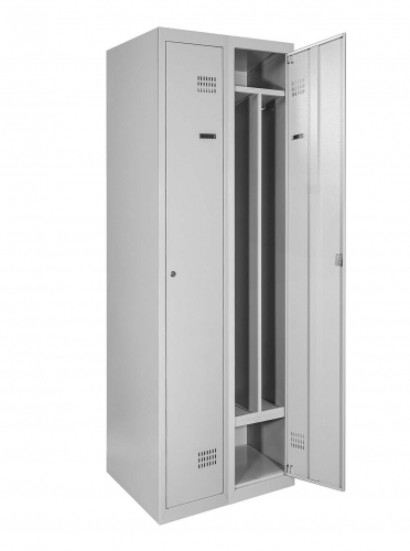 Кожна секція шафи обладнана 4 гачками для легкого підвішування одягу, перекладеною для вішаків, а також поличкою для зручного розміщення речей. Крім того, кожна секція оснащена врізним механічним замком типу прапорця з двома ключами для забезпечення максимальної безпеки зберігання. Таким чином, шафи одягові металеві є надійним та функціональним рішенням для організації зберігання одягу у будь-якому приміщенні.