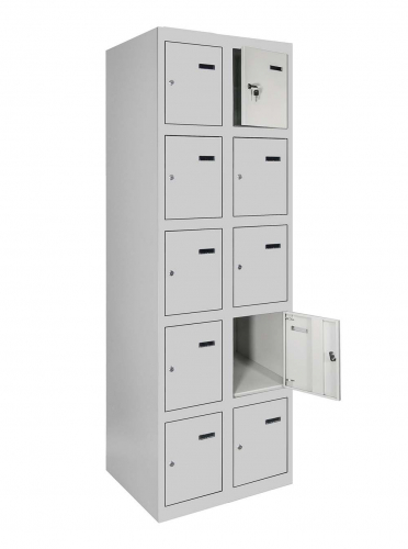 Універсальність конструкції дозволяє зручно складувати шафи в будь-якому приміщенні, а можливість їхнього з'єднання у вигляді блоків робить їх ідеальним варіантом для організації простору будь-якого розміру. Кожна секція шафи оснащена врізним механічним замком з двома ключами для забезпечення надійності та конфіденційності зберігання.