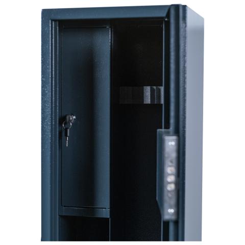 Вертикальний трейзер розміром 690х130х140 мм має три секції, що дозволяють зберігати патрони окремо від зброї. Це сприяє кращій організації простору всередині сейфу. Додаткова полиця дозволяє зберігати аксесуари та документи.