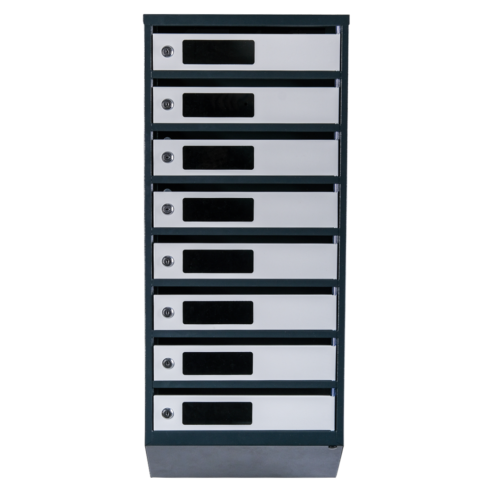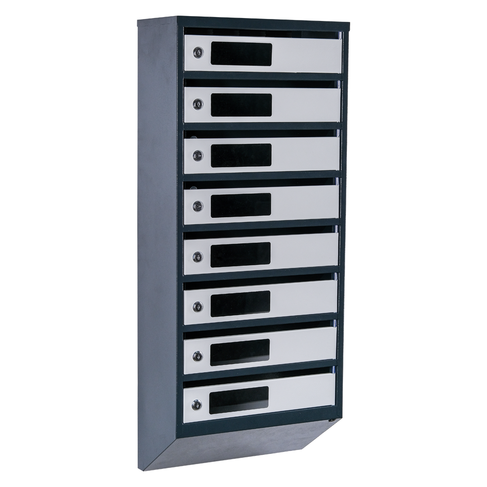 Ця поштова скринька ідеально підходить для будинків з восьмома квартирами. Вона має сучасний дизайн із антрацитовим корпусом та сірими дверцятами, що надає будинку стильний вигляд. Виготовлена з високоякісного металу з порошковим фарбуванням, вона дуже міцна та стійка до впливу негоди. Кожна секція обладнана замком з двома ключами для забезпечення безпеки та конфіденційності поштових відправлень мешканців. Ця поштова скринька ідеально підходить для використання в багатоквартирних будинках, де важлива зручність та надійність поштової системи.