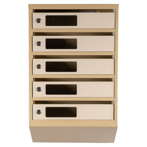 Поштова скринька Галіндустрія ЯП05С ідеально підходить для будинків з невеликою кількістю квартир. Завдяки своїм розмірам і п'ятьом секціям вона забезпечить зручне та безпечне зберігання пошти для п'яти мешканців. Бежевий колір корпусу та світло-бежеві дверцята надають їй естетичний вигляд, а порошкове фарбування забезпечує довговічність і стійкість до корозії. Кожна секція оснащена замком з двома ключами для забезпечення конфіденційності та безпеки пошти кожного мешканця.