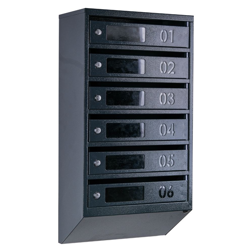 Кожна секція оснащена замком з двома ключами, що забезпечує конфіденційність та безпеку поштових відправлень мешканців будинку. Щілинний тип дверцят дозволяє легко та зручно отримувати пошту, не відчиняючи всю скриньку.