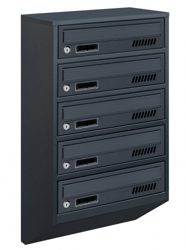 LEVMETAL Е1-05.А - це стильний та функціональний поштовий ящик із 5 косими секціями, призначений для використання в багатоквартирних будинках. Модель E1-А в антрацитовому кольорі (RAL 7016) від LEVMETAL поєднує в собі естетику та практичність.