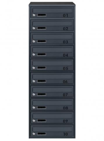 Поштова скринька LEVMETAL багатосекційна Е2-10.B у кольорі антрацит (RAL 7016) призначена для встановлення в багатоквартирних будинках. З щілинами та клапанами на дверцятах дозволяє легко отримувати листи та іншу кореспонденцію.