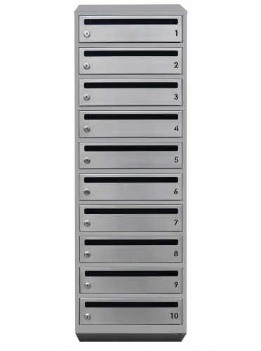 Сірий колір моделі E1-10.F в поєднанні з вирізаними номерами квартир та щілиною робить цей поштовий ящик ефектним та практичним елементом вашого будинку.