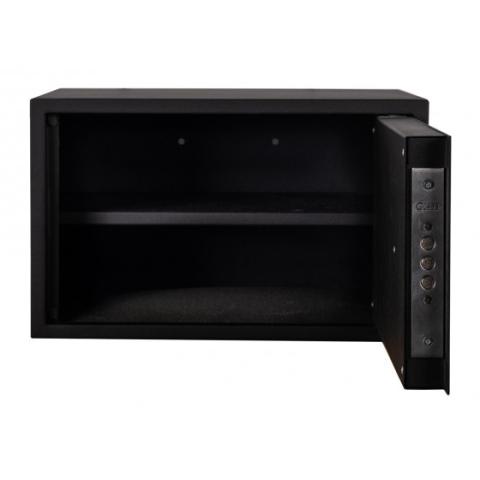 Сейф виготовлений з металу товщиною 1,0 мм та 1,5 мм, з загальною вагою 6,4 кг. Розмір: 235x385x270 мм.