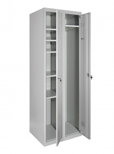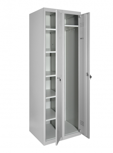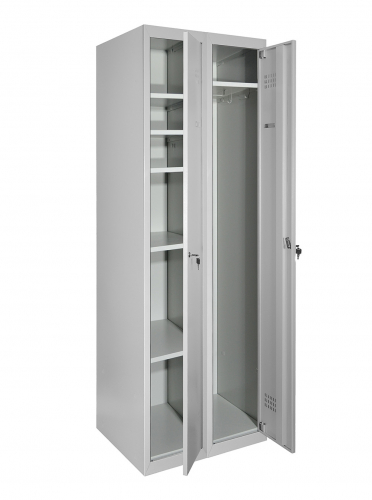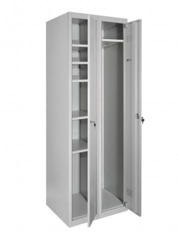 Матеріал: Метал, Покриття: Полімерно-порошкове, Конструкція: Збірно-розбірна, Товщина металу 0.5 мм, Тип шафи: Господарський (ШГМ), Кількість секцій: 2, Кількість дверей у секції: 1 Ліва секція -, Кількість відділень: 6 з можливістю регулювання висоти полиць