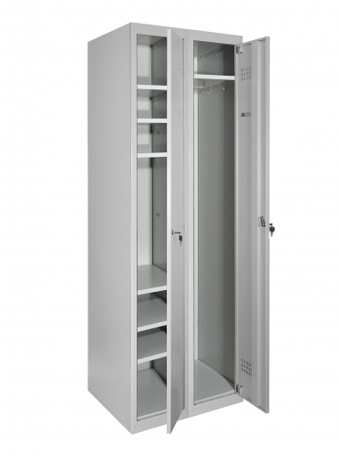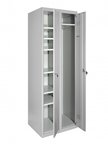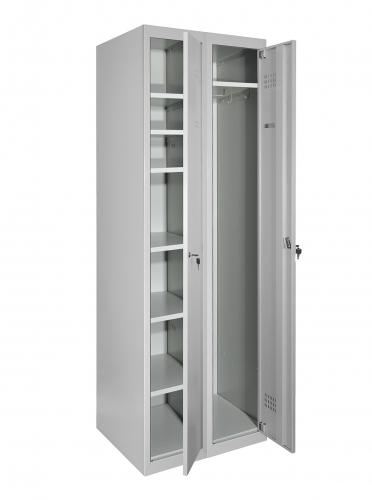 Матеріал: Метал, Покриття: Полімерно-порошкове, Конструкція: Збірно-розбірна, Товщина металу 0.5 мм, Тип шафи: Господарський (ШГМ), Кількість секцій: 2, Кількість дверей у секції: 1 Ліва секція -, Кількість відділень: 7 з можливістю регулювання висоти полиць