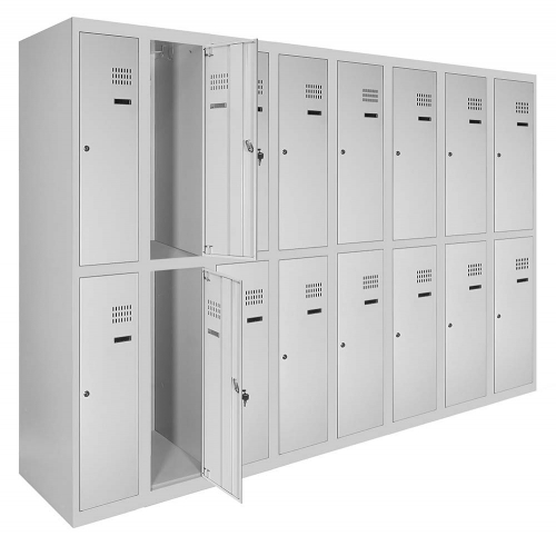Кожна секція шафи обладнана 4 гачками для легкого підвішування одягу, перекладеною для вішаків, а також поличкою для зручного розміщення речей. Крім того, кожна секція оснащена врізним механічним замком типу прапорця з двома ключами для забезпечення максимальної безпеки зберігання. Таким чином, шафи одягові металеві є надійним та функціональним рішенням для організації зберігання одягу у будь-якому приміщенні.