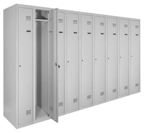 Кожна секція шафи обладнана 4 гачками для легкого підвішування одягу, перекладеною для вішаків, а також поличкою для зручного розміщення речей. Крім того, кожна секція оснащена врізним механічним замком типу прапорця з двома ключами для забезпечення максимальної безпеки зберігання. Таким чином, шафи одягові металеві є надійним та функціональним рішенням для організації зберігання одягу у будь-якому приміщенні.