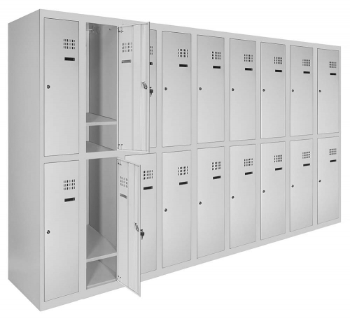 - Додаткові характеристики: Матеріал: метал. Покриття: Полімерно-порошкове. Конструкція: Збірно-розбірна. Товщина металу 0,5 мм. Тип шафи: Дворівневі з нижньою полицею (ШОМ 2 нп). Кількість секцій: 9. Кількість дверей у секції: 2. Габарити (ВхШхГ): 1800 х 3600 х 500 мм.