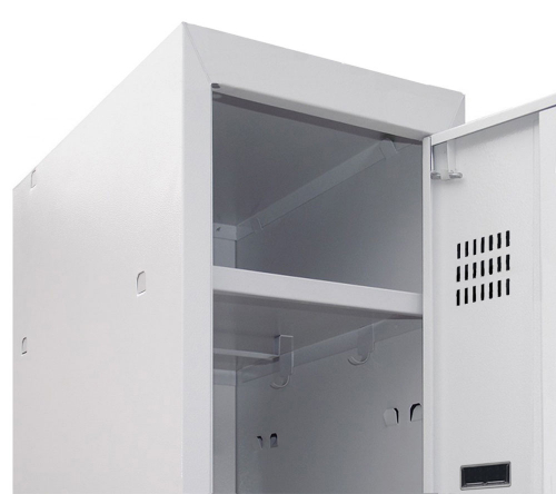 Кожна секція шафи обладнана 4 гачками для легкого підвішування одягу, перекладеною для вішаків, а також поличкою для зручного розміщення речей. Крім того, кожна секція оснащена врізним механічним замком типу прапорця з двома ключами для забезпечення максимальної безпеки зберігання. Таким чином, шафи одягові металеві є надійним та функціональним рішенням для організації зберігання одягу у будь-якому приміщенні.