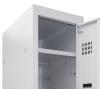 Кожна секція шафи обладнана 4 гачками для легкого підвішування одягу, перекладеною для вішаків, а також поличкою для зручного розміщення речей. Крім того, кожна секція оснащена врізним механічним замком типу прапорця з двома ключами для забезпечення максимальної безпеки зберігання. Таким чином, шафи одягові металеві є надійним та функціональним рішенням для організації зберігання одягу у будь-якому приміщенні.